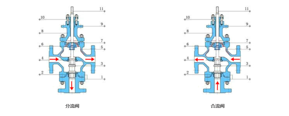 氣動三調(diào)節閥(fá)閥體為三(sān)通(tōng)結構,即一進兩出(分流型(xíng)),兩進(jìn)一(yī)出(合流型),其(qí)中(zhōng)三通合流調節閥用於將兩(liǎng)種流體混合成第三(sān)種流體,或兩種不同溫度的同種(zhǒng)流(liú)體,混合成同一溫度流體。而三通分流閥則是將一種流體分成(chéng)兩(liǎng)路流體。